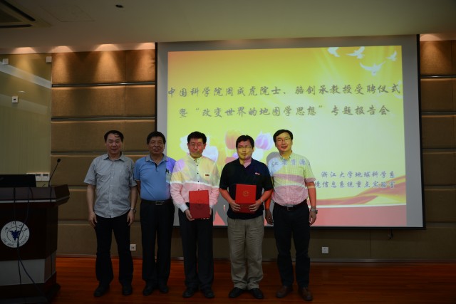 2014年6月15号下午两点,中国科学院周成虎院士、骆剑承教授受聘仪式暨“改变世界的地图学思想”专题报告会在浙江大学紫金港校区校友楼紫金港厅隆重举行,原浙江大学研究生院副院长杨树锋教授,浙江大学地球科学系主任陈汉林教授以及浙江大学地球科学系部分师生共120余人参加了本次活动,活动由浙江省资源与环境信息系统重点实验室主任刘仁义教授主持。