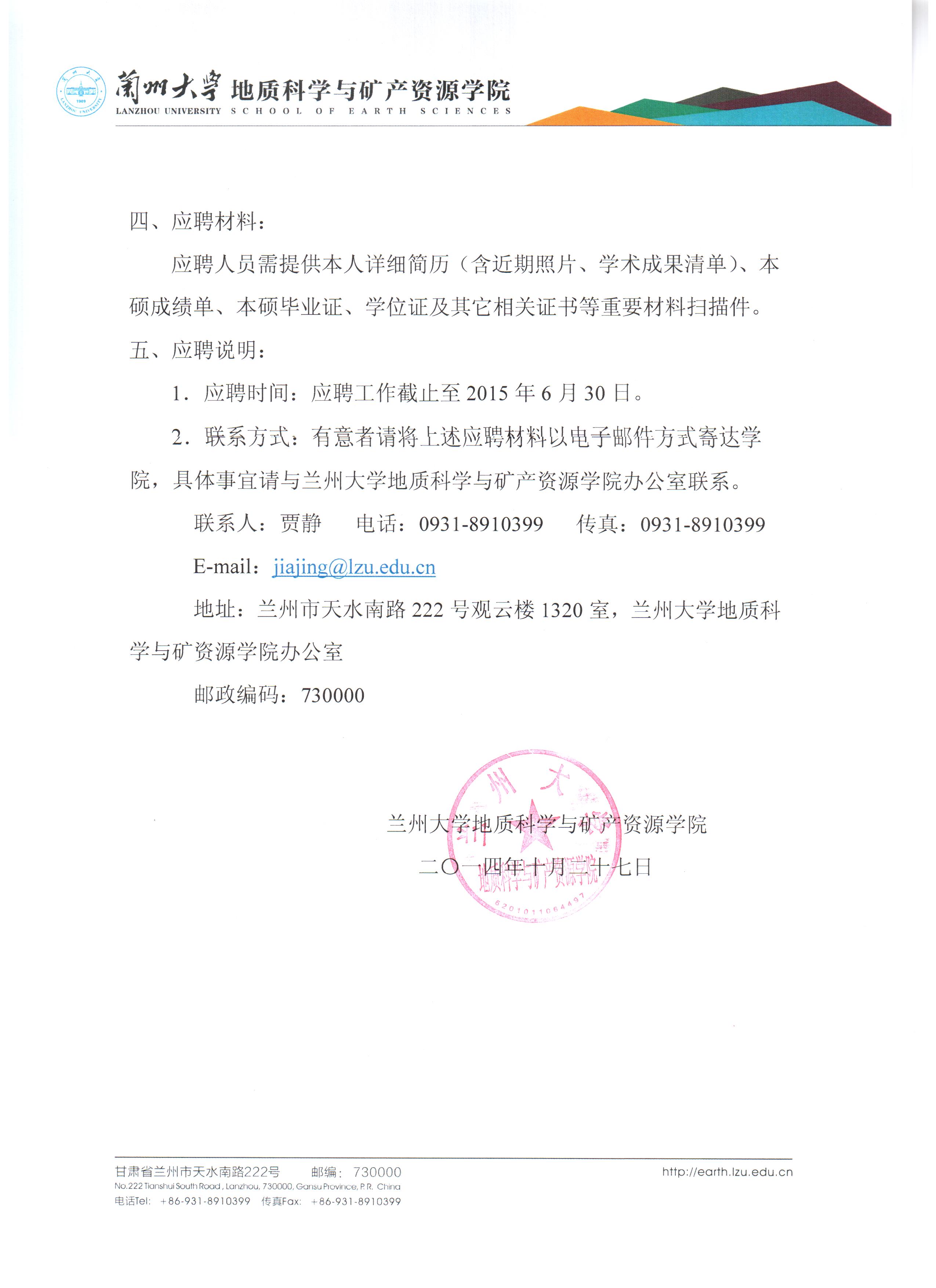兰州大学地质科学与矿产资源学院面向国内相关高校、科研单位招聘优秀应届博士毕业生