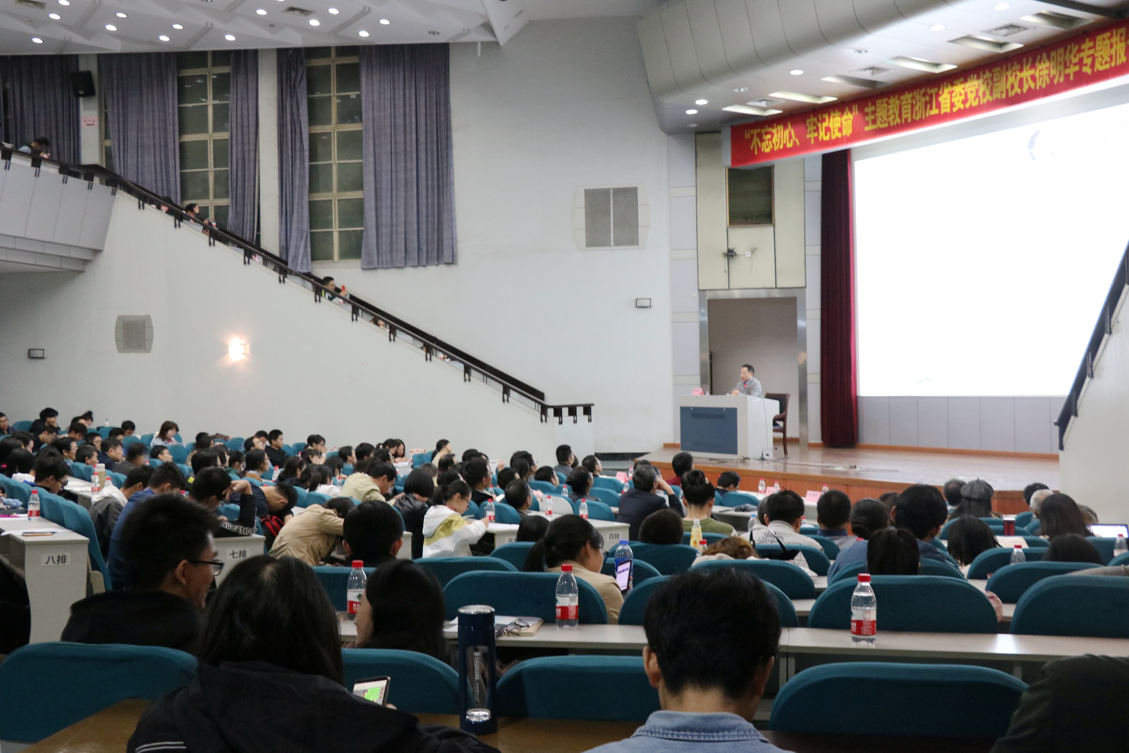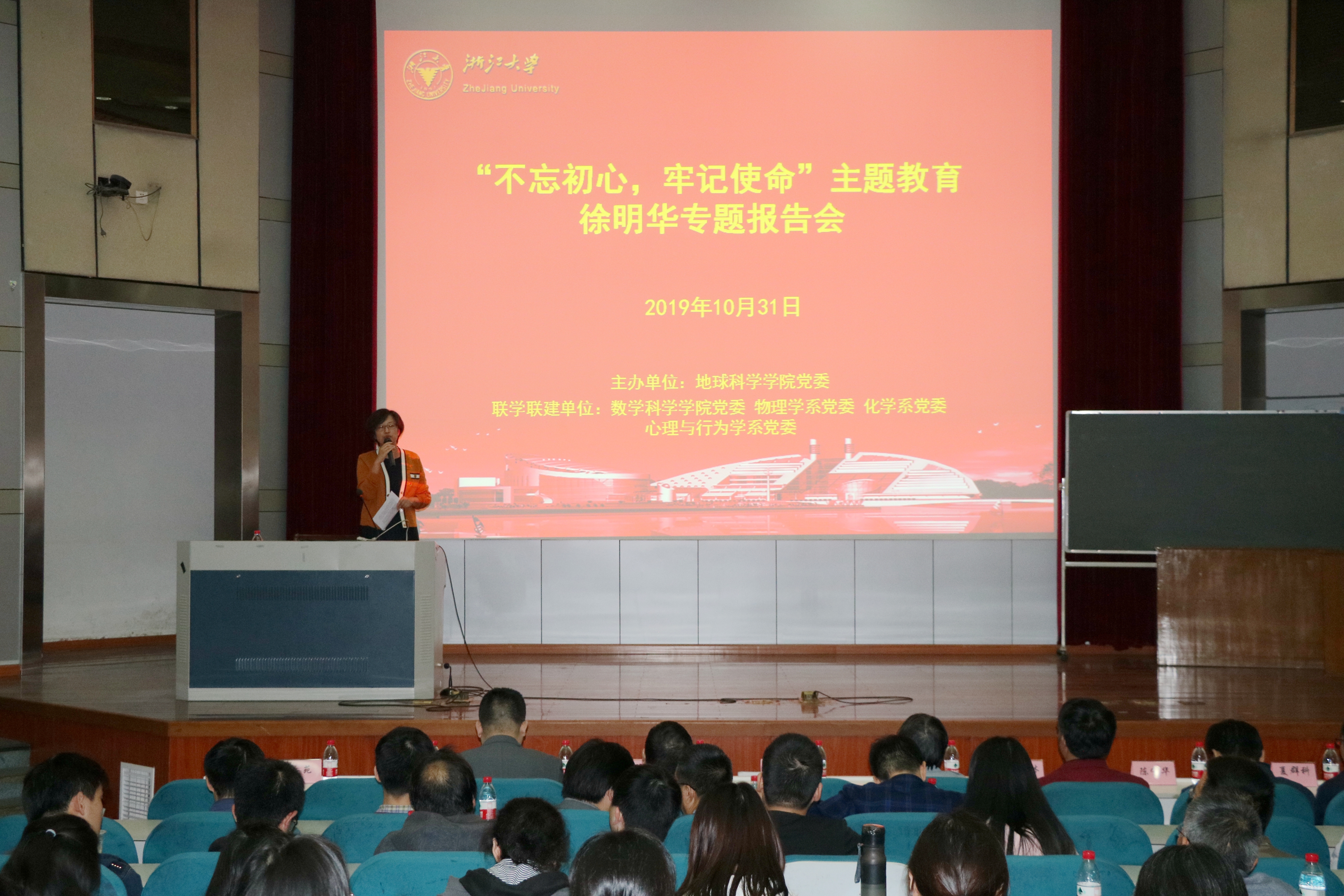 为深入学习贯彻习近平新时代中国特色社会主义思想,深刻领会“不忘初心、牢记使命”主题教育的重大意义,牢牢把握“守初心、担使命,找差距、抓落实”的总要求,地球科学学院党委于2019年10月31日晚在玉泉校区第七教学大楼影视厅举办“不忘初心、牢记使命”主题教育专题报告会,邀请浙江省委党校副校长、我院86届地质学专业校友徐明华作题为“八八战略:从浙江实践到治国方略”的专题报告。本次报告会也是理学部5个院系党委围绕“不忘初心、牢记使命”主题教育开展的一次联学联建活动。地球科学学院班子全体成员,化学系党委书记应伟清、副书记潘贤林,以及400余名师生党员、入党积极分子参加了本次主题教育活动。报告会由地球科学学院党委书记王苑主持。