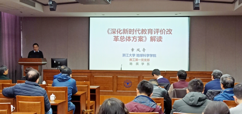首先,地科学院教工第一党支部书记章凤奇对《深化新时代教育评价改革总体方案》进行了解读。他梳理了文件的关键词,解读了文件出台背景、指导思想、主要原则、改革目标、重点任务和组织实施等内容,并就各位老师关心的部分问题进行了重点介绍和阐述。