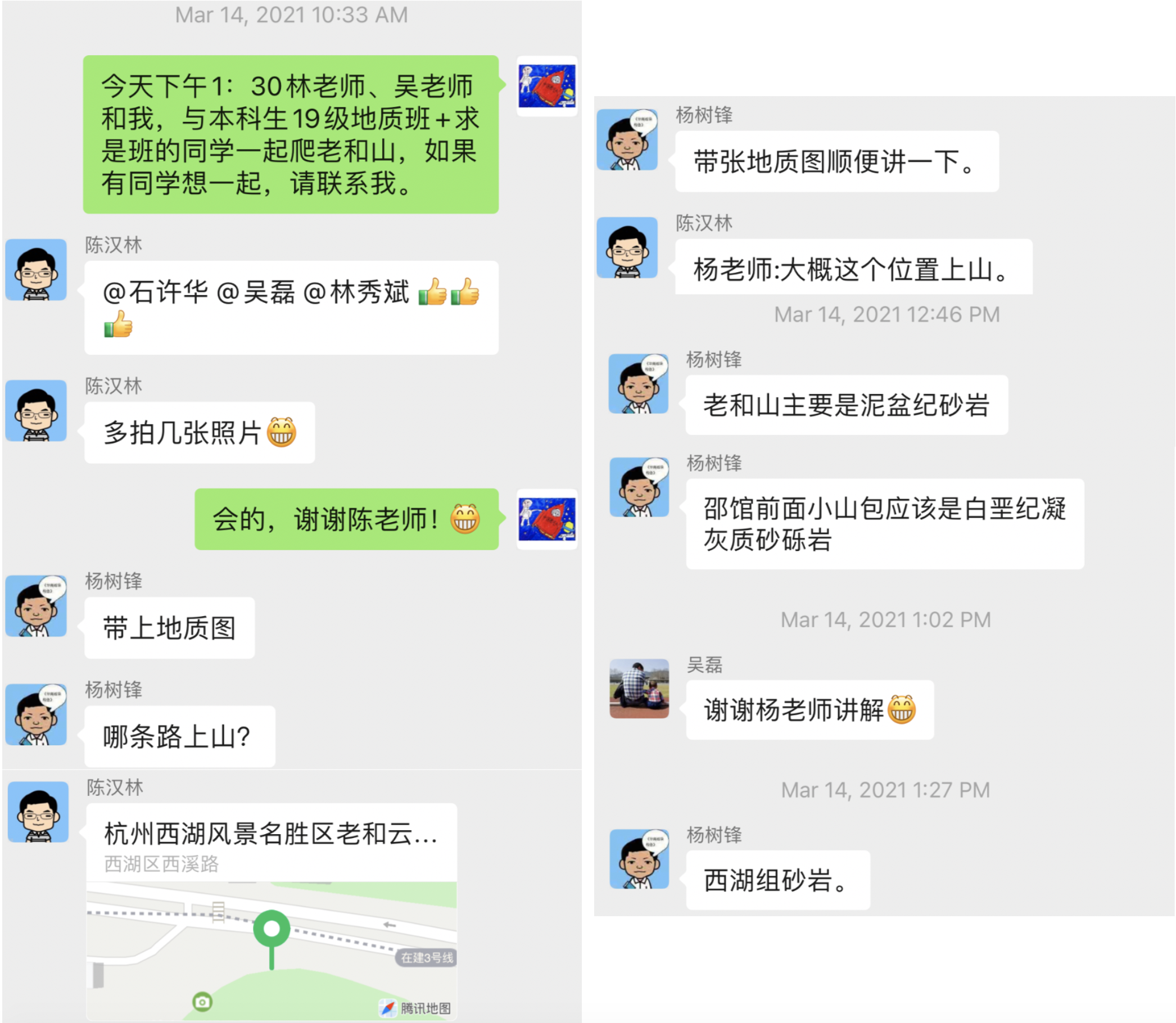 2021年3月14日,浙江大学地球科学学院地质学1901班联合竺可桢学院求是地质1901班以及求是地质2001班的部分同学,结合“三·五学雷锋志愿者活动”,在西湖老和山景区开展了“仲春老和行,乐探地学中”——老和山游学活动。《古生物与地史学》任课老师林秀斌、《构造地质学纲要》任课老师吴磊、班主任石许华等以及博士研究生田禾丰亦参加了活动。