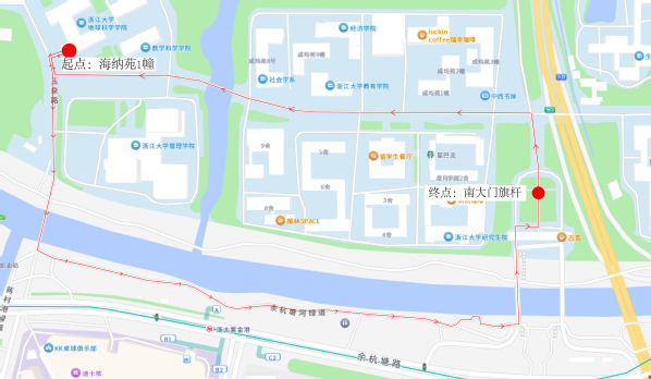 活动路线:从紫金港校区海纳苑1幢出发,沿玉泉路至南2门,出校门后沿余杭塘河绿道至浙江大学南大门,于南大门旗杆处合照留念并现场签到,沿校内道路返回海纳苑1幢。